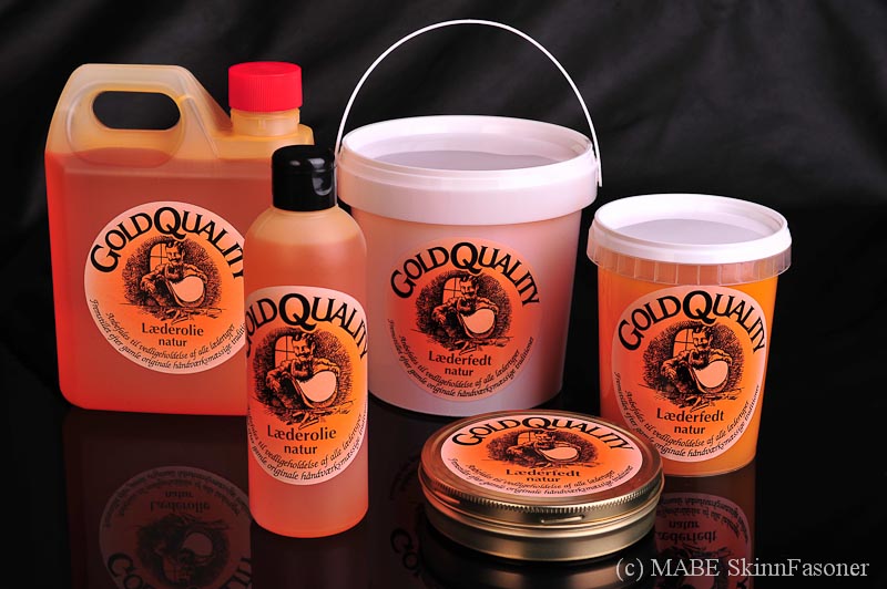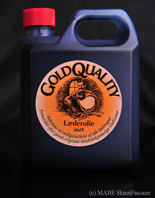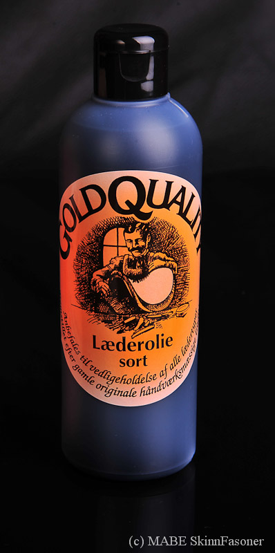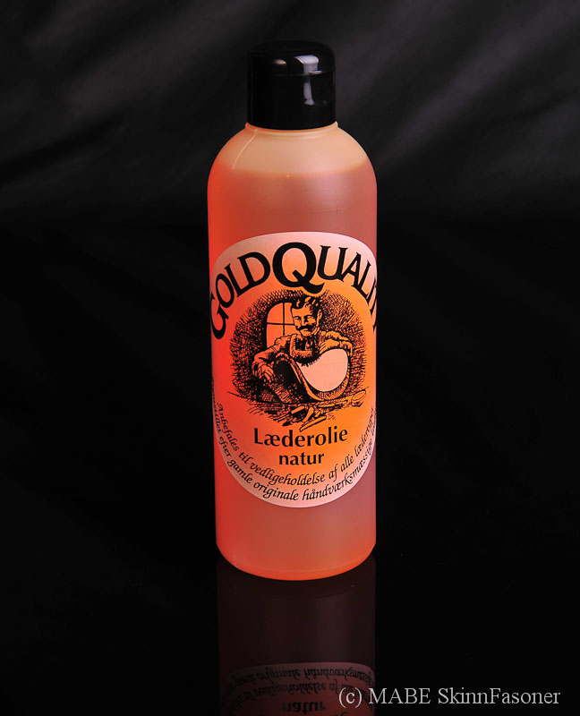 MABE SkinnFasoner rekommenderar GoldQuality Läderolja. Går med fördel att användas till bokryggar, sadlar, möbler och mc-utrustning. Finns i två färger välj mellan naturell eller svartolja.