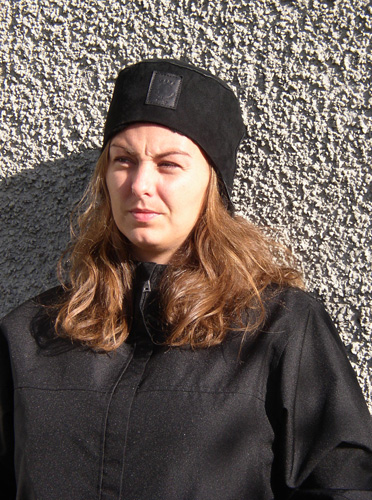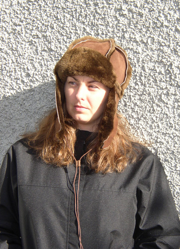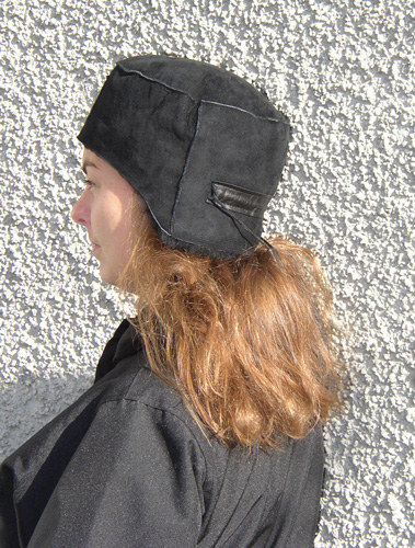 Passar både män och kvinnor. En flygarhjälm med stora öronlappar och skärm.Går att dra ihop under hakan.