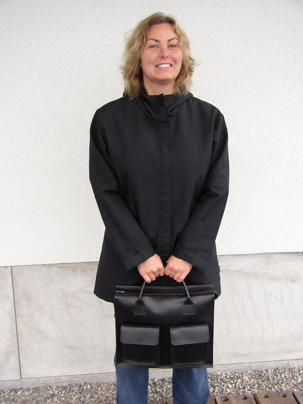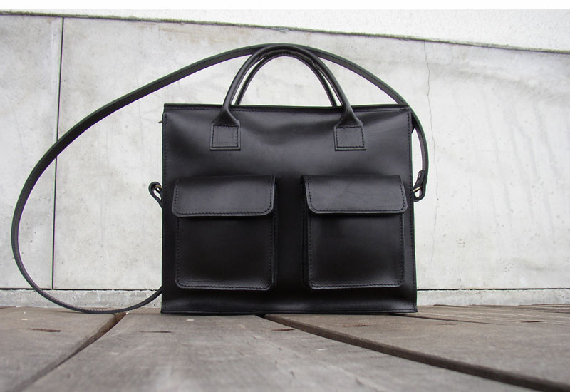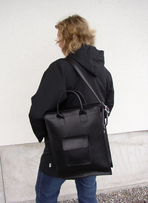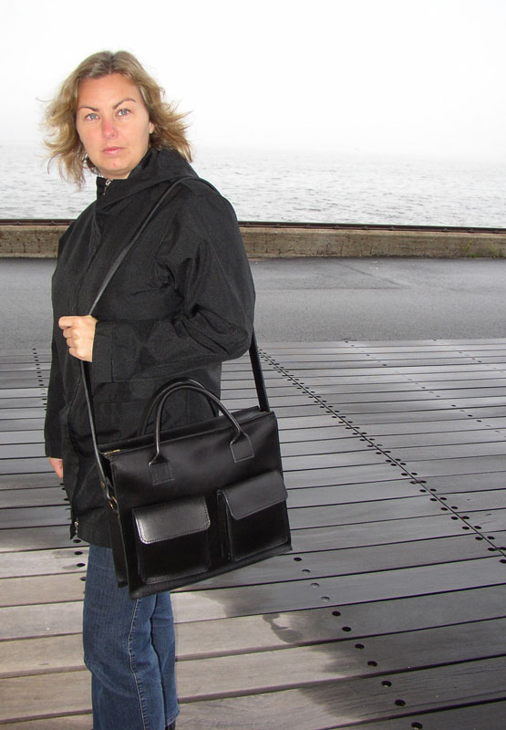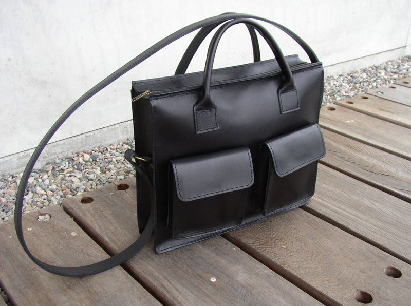 Praktisk väska för dig som har mycket att bära. Tillverkad i kalvskinn. Stor nog för att få ner en A4 pärm. Fodrad med tyg och har flera innefickor. Har handtag och axelrem.